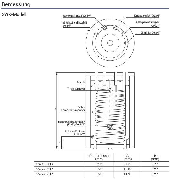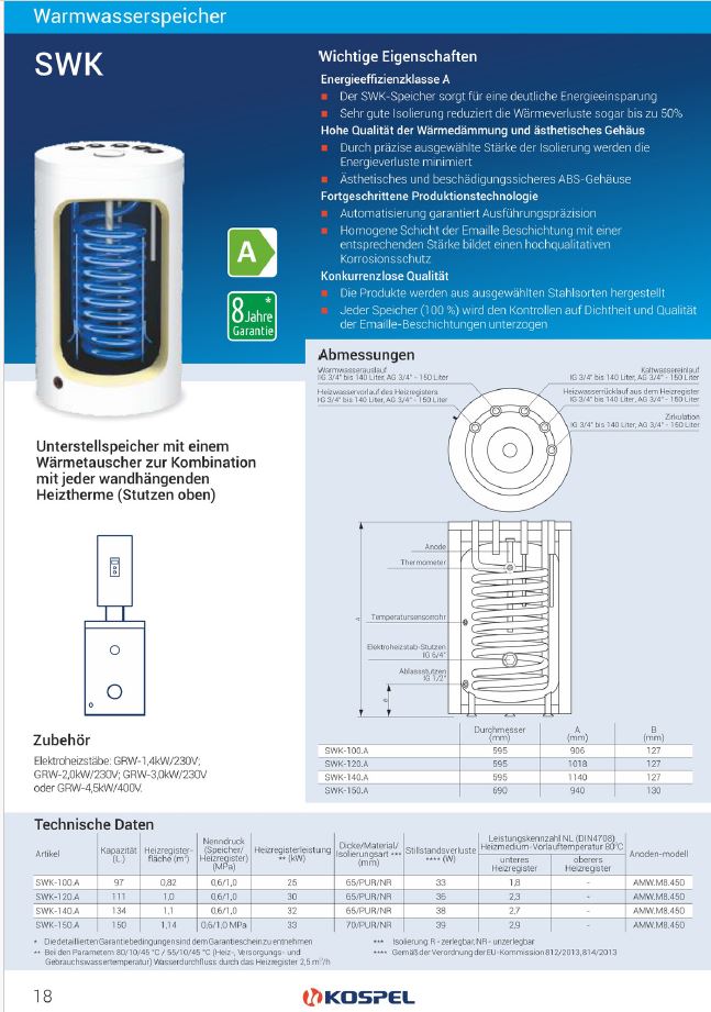 Der SWK-Speicher wurde dank seiner guten Isolierung aus 65 mm dickem PUR-Schaum der Energieklasse A zugeordnet. Er bietet höchste Energieeffizienz, reduziert den Wärmeverlust bis zu 50% und im Vergleich zu einem ähnlichen Wärmespeicherder Energieklasse C spart bis zu 320 kWh Energie pro Jahr ein